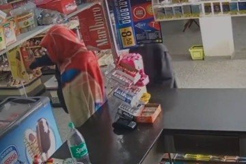 As imagens mostram a chegada da dupla. Um deles usa casaco preto e, o outro, entra cobrindo o rosto com uma toalha do personagem fictício. Armados com uma peixeira, os criminosos renderam o proprietário, de 55 anos, e levaram cerca de R$ 500 em espécie, cigarros e isqueiros.