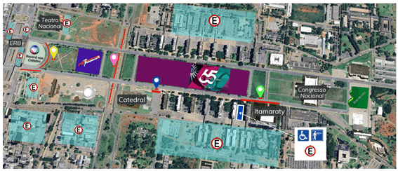 Vale estacar que o Buraco do Tatuí sentido norte está em obras. Outra informação importante é que o controle de acesso ao estacionamento da Cúria será realizado pelo pessoal da Catedral, sendo a entrada e saída realizadas pela via S2. Na entrada do túnel do Itamaraty, o Detran-DF fará controle da entrada e saída de veículos de PCD e Idosos para os estacionamentos e impedirá a entrada de pedestres pelo túnel. Os agentes implantarão dois pontos de travessia de pedestres nas extremidades da alça leste do Eixo Rodoviário, com a presença de viaturas a partir das 13h para facilitar o tráfego de pedestres que se dirigem aos locais de show.
