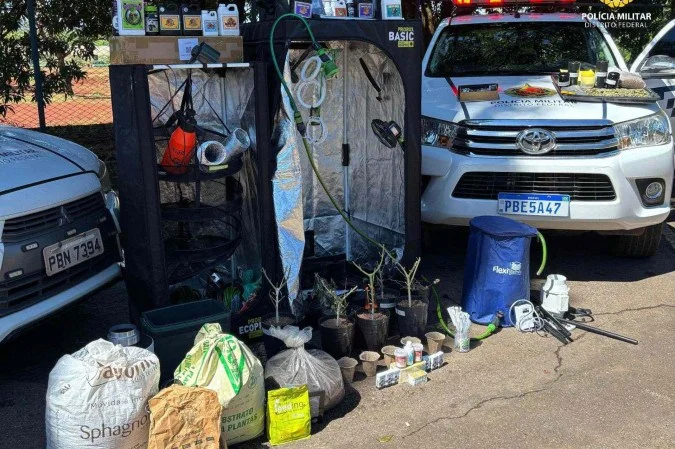 Com a entrada autorizada pela moradora, a PMDF localizou equipamentos voltados ao cultivo de maconha, como estufas, refletores e controladores de temperatura, além de vasos com plantas em crescimento e receitas para o preparo do entorpecente.