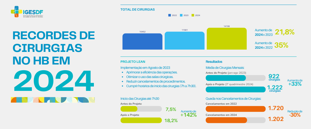Antes do Projeto Lean, entre janeiro e agosto de 2023, o HBDF realizava, em média, 922 cirurgias mensais. “Após a implementação do projeto, pode-se observar avanço para a média de 1.222 cirurgias realizadas no terceiro quadrimestre de 2024, o que representa um aumento de 33%”, conta Porfírio.
